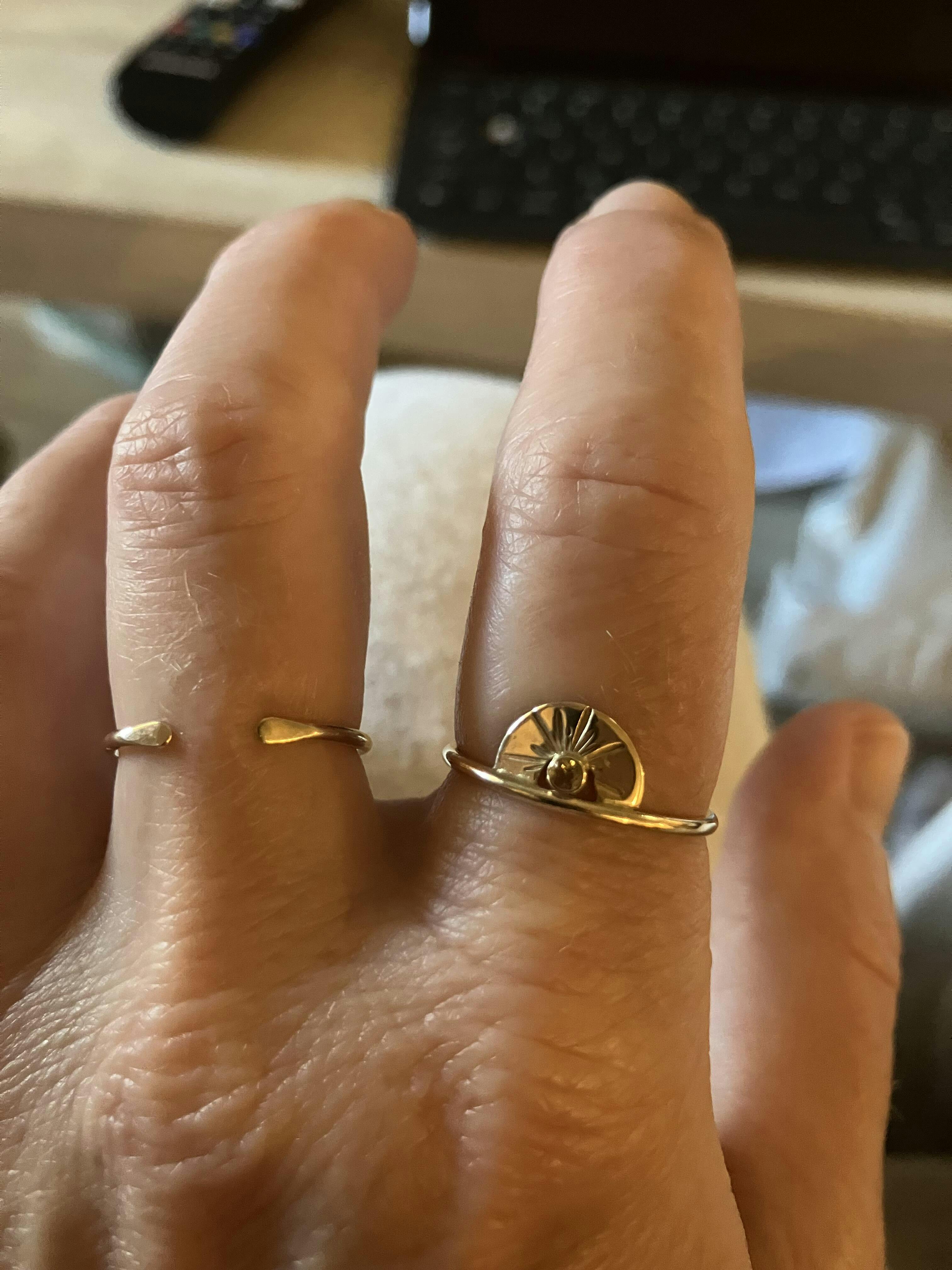 A golden horizon you can wear. The one-of-a-kind Sunset Ring features a natural honey topaz glowing beneath radiant lines and a rising sun motif. Made from solid 14k yellow gold, she captures that golden-hour magic—warm, grounding, and forever luminous.